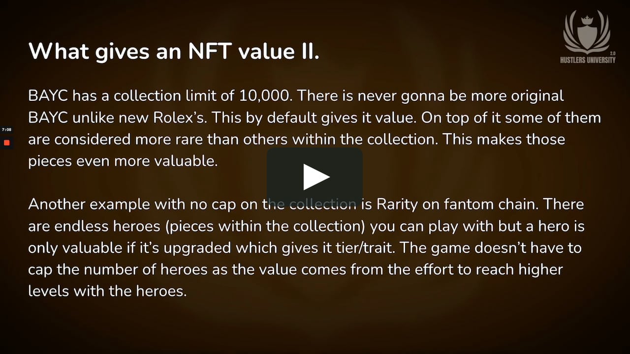 NFT Intro II Value of NFT's An NFT like everything else that has value in this world has to have desirability (symbol, utility) and be scarce. NFT's can give you status like other brands by reaching a symbol state. Everyone knows Gucci or Ferrari. We desire it to gain more status. Uniqueness is one form of scarcity. Uniqueness comes from limited numbers. Limited numbers come from capping the collection (10,000 BAYC) and/or adding different tiers/traits to the collection (laser eyed BAYC). Same can be said for in-game assets. Not everyone can have the best ones. We can also take this to the next level. BAYC has a collection limit of 10,000. There is never gonna be more original BAYC unlike new Rolex’s. Another example with no cap on the collection is Rarity on fantom chain. There are endless heroes (pieces within the collection) you can play with but a hero is only valuable if it’s upgraded which gives it a tier/trait. The game doesn’t have to cap the number of heroes as the value comes from the effort to reach higher levels with the heroes and there is a limited number of upgraded heroes. PFP (Brand/Status symbol ) It’s the same like with anything else like clothes or art pieces. It’s valuable because it’s a flex. A Gucci bag is a flex. You can signal to the world that you can afford it hence you are higher value. Why can you flex with a Gucci bag? Because it became a symbol and everyone recognizes the brand. Symbols rule the world. There is no bigger flex than buying something totally useless for a ton of money. This is why celebrities are buying BAYC. Gaming Gaming is one of the biggest industries. In the gaming industry you can’t really own an asset as it’s the property of the game makers and they could take it from you if they decide so. With NFT’s and blockchain users can own their gaming assets and with the development of the metaverse they will be able to transport their assets between games. https://vimeo.com/680767069