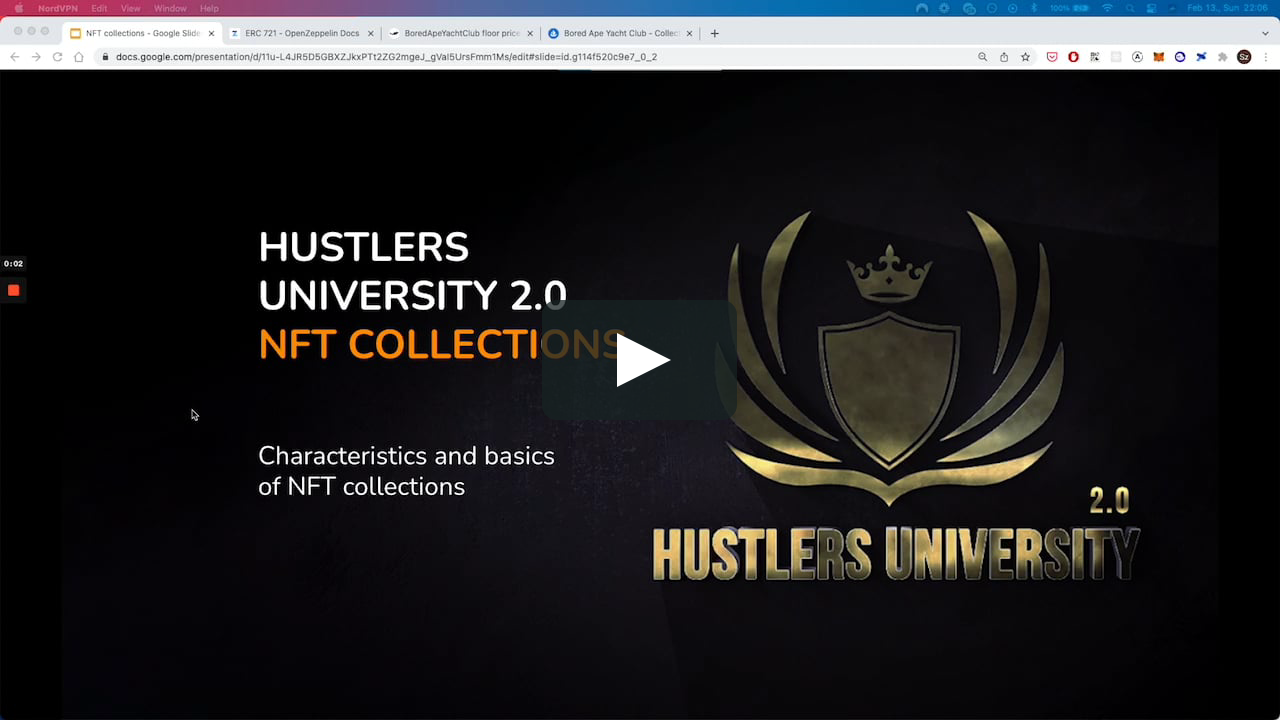 NFT collections II You also gotta learn market related words: Rarity: Traits of the item which makes the more scarce traits highly collectible. This is coded in the smart contract but it's more important for valuation. Floor price: Cheapest item in the collection. Usually items with lowest rarity score are the cheapest. Important metric to understand how a certain collection is doing. Bid: Offer for an item on a marketplace that can be accepted by the owner and other authorized addresses. Be careful not to accept low bids. Unique holders: Unique addresses that hold at least one item from the collection. The more unique holders the better. In general it's good not to have whales in a project who would slowly dump on you and manipulate the price. Volume: Sum of the price of traded items in given time frame. Good indicator of how much interest the project is getting. Listed/Delisted: Number of items that are up for sale. The less item is listed the more ppl wanna hold to their items. Some basic market calculations: Cap (max num of items): It is usually between 500 and 20,000. If it is fewer it’s hard to reach network effect, if it’s higher the value is diluted. Market cap: The sum of the prices of all the items. This is usually an estimated number as not all items are for sale and rare items can reach much higher value than floor ones. Floor price * number of items will give you the minimum estimation. For BAYC as of now this would be 100ETH * 10,000 = 1 million ETH which is around 3 billion USD. The actual number with the considering rarities would be higher. Mint price: This can vary based on the status of the market and the collection. As of Feb 2022 on ethereum chain it’s usually somewhere between 0.05 and 1 ETH. More expensive mints than that should justify the price. https://vimeo.com/680767286 (edited)