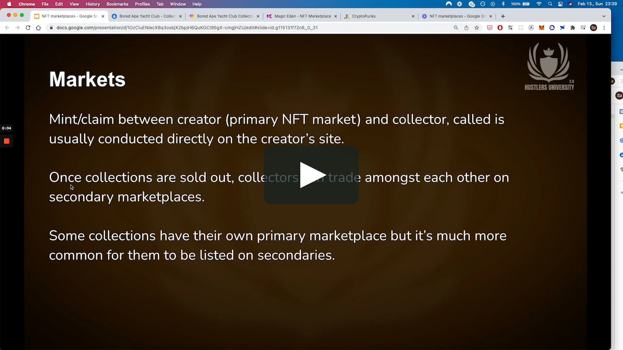 NFT marketplaces Before NFT's are tradable they have to be minted/claimed first. Mint/claim between creator and collector is usually conducted on the creator’s site. You could say this is a primary market for claiming. Minting is usually limited by wallets to make it harder for whales to buy too many. Most of the hyped projects have whitelists besides minting limits to be able to have fair launch. Once collections are sold out (all of them are claimed/minted), ppl can trade amongst each other on marketplaces. This usually happens on secondary marketplaces like OpenSea. Only a few collections can be traded on the creator's site. Every chain has its marketplaces. As of now the main chain for NFT’s is ethereum. Other chain that has significant NFT’s too is solana. NFT marketplaces can be general purpose or focusing on some aspects of trading. The largest general purpose marketplaces on ethereum are OpenSea and LooksRare. On solana it is Magic Eden. There are other very useful marketplaces for sweeping floors, finding rarities, or OTC trades. OpenSea Generic purpose marketplace where basically all the NFT’s on ethereum are listed. Currently by far the largest. Opensea take 2.5% after every trade. You can’t buy several NFT’s at the same time which makes it expensive and slow to trade if you wanna buy multiple items of the same collection. Gem.xyz Makes it easy to buy several items of the same collection with optimized gas. This makes it much faster and cheaper to trade and gives the opportunity to whales to buy into smaller collections. Also very useful for sweeping floors and filtering based on rarity traits. Magic Eden Main marketplace on solana chain. Solana chain gas fees are dirt cheap which makes it easy for people with little money to get NFT’s. Centralized exchanges Centralized crypto exchanges make NFT’s more accessible to the crowd but you shouldn't be using these. https://vimeo.com/680767392 (edited)